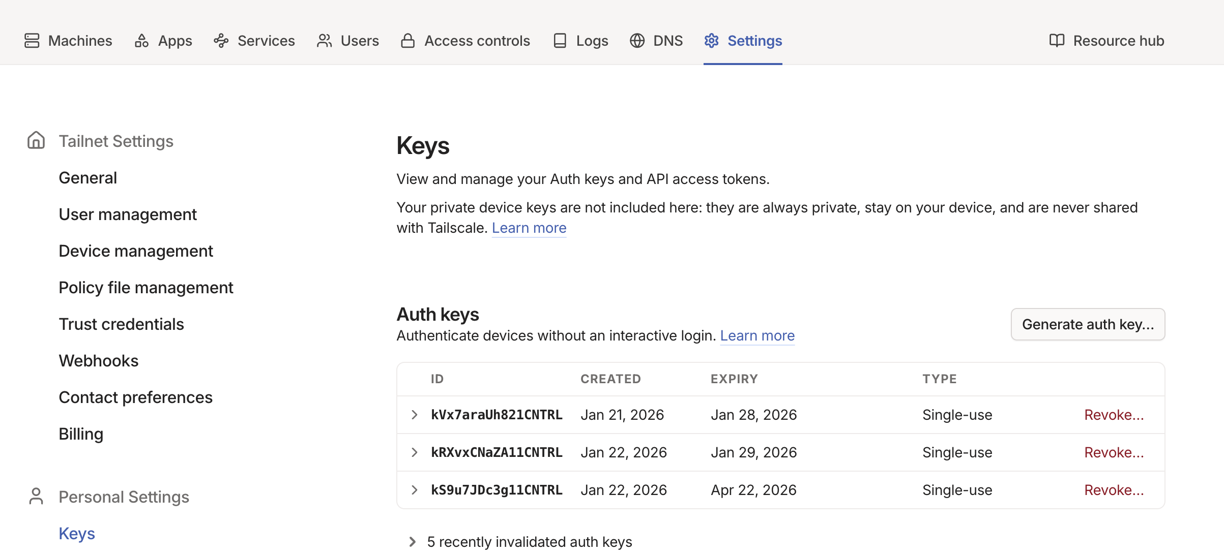 docker run -d --name=tailscaled -v /var/lib:/var/lib -v /dev/net/tun:/dev/net/tun --network=host --cap-add=NET_ADMIN --cap-add=NET_RAW --env TS_AUTHKEY=tskey-auth-k8LFcByYFn11CNTRL-WmvzrnsfwsZ553uhU9EbsZmQjqR1jffm6 tailscale/tailscale设置永不过期,disable key expire --> enable key expire