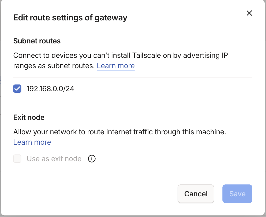 tailscale set --advertise-routes=192.168.0.0/24需要进管理界面同意,edit route settings