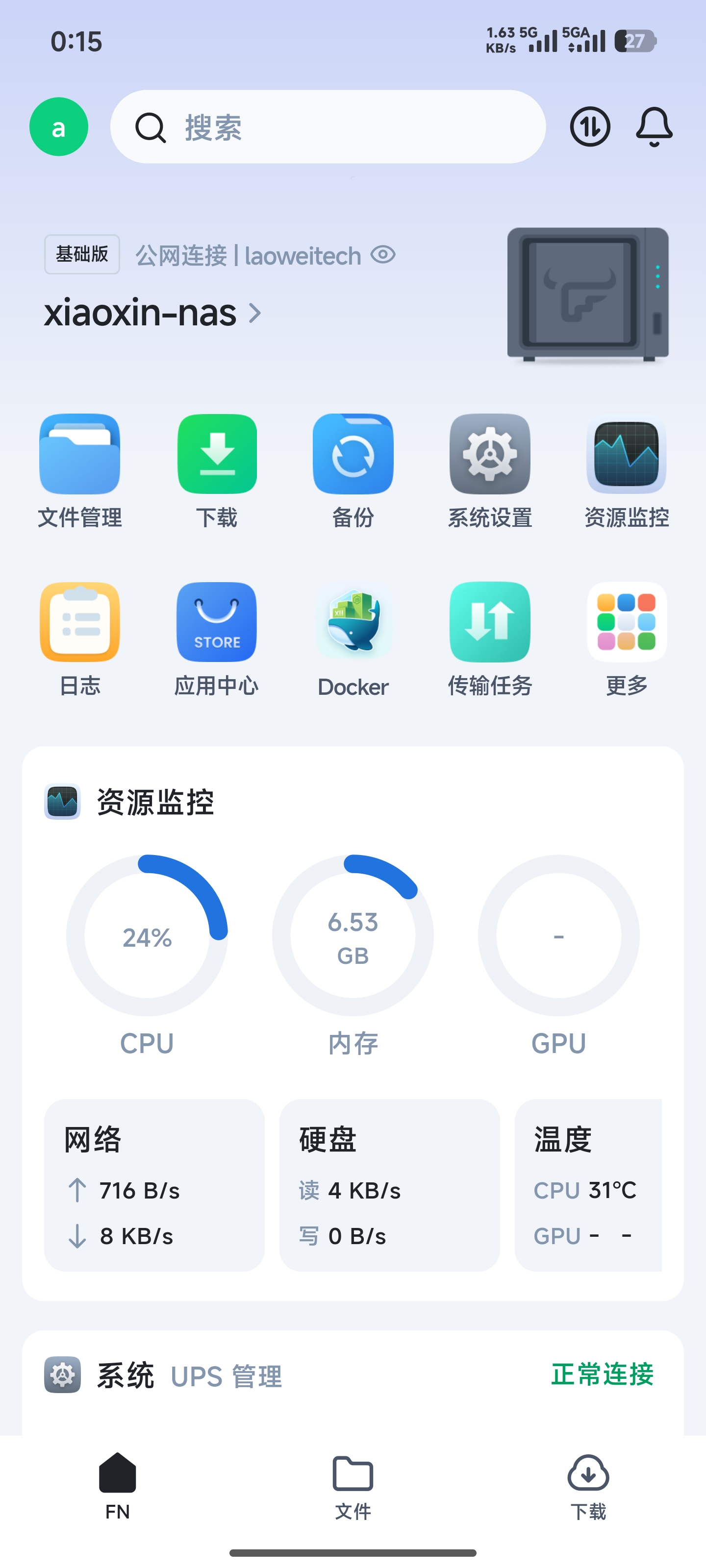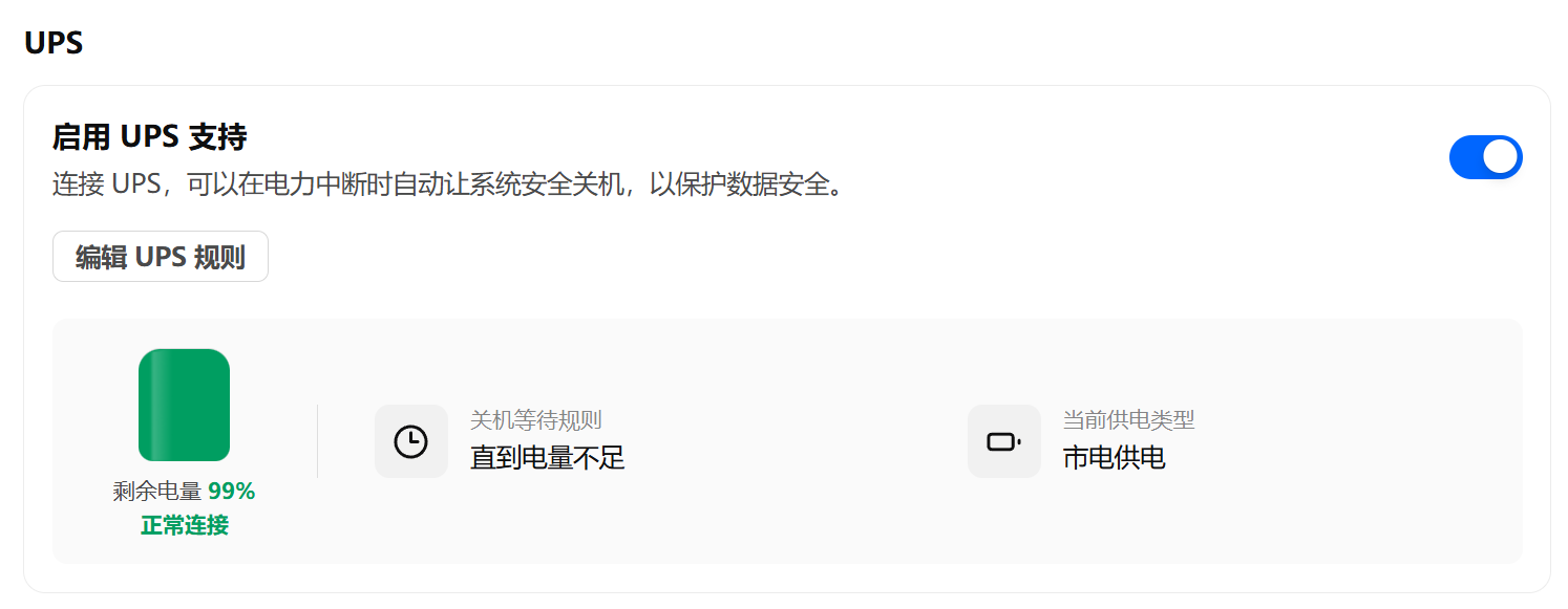 飞牛可以直接识别笔记本自带的电池,作为UPS,可在电量不足时自动关机