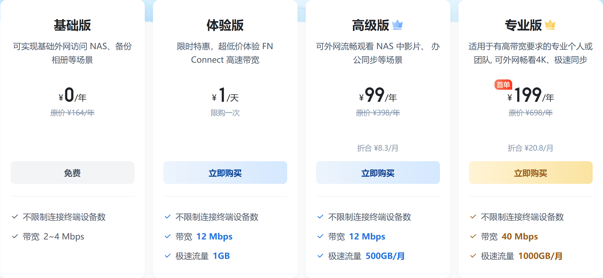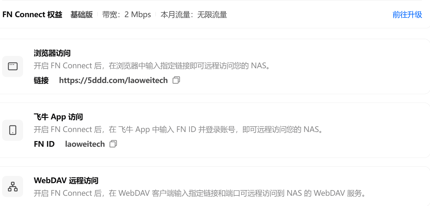 免费权益如下:2M带宽,无限流量,支持浏览器访问,飞牛APP访问和WebDav访问,按照下面的规则访问即可