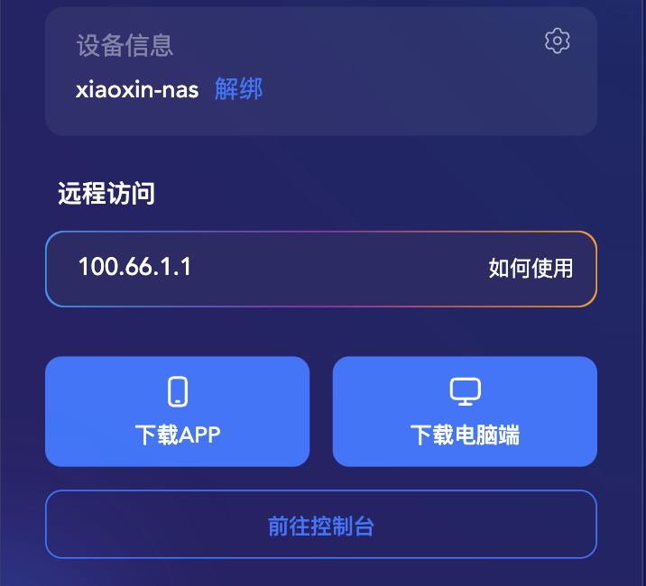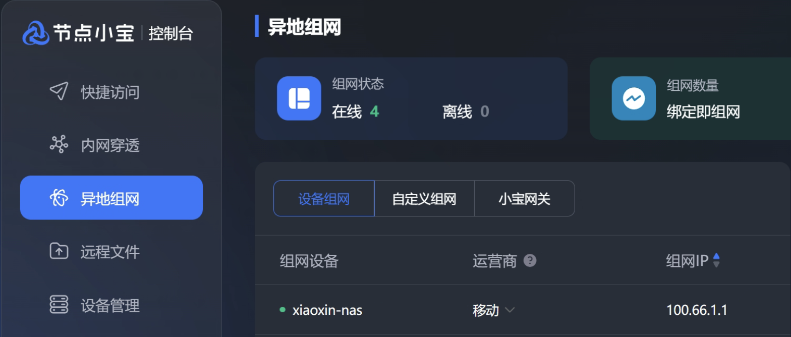 前往控制台--》异地组网即可看到xiaoxin-nas已被加入组网中